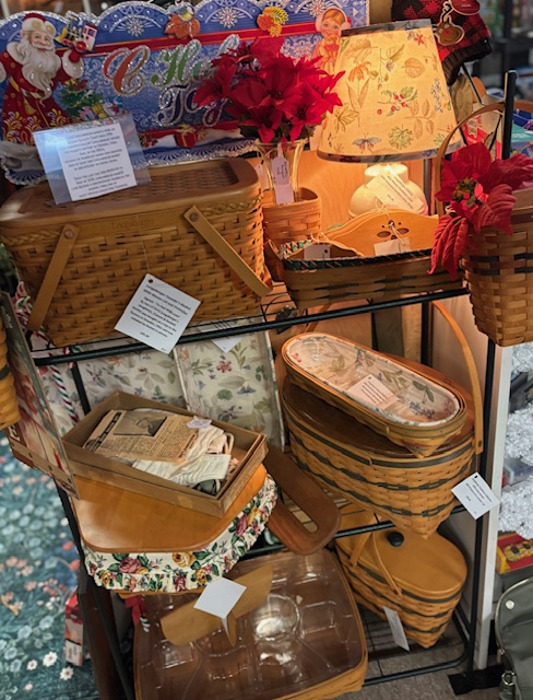 Diane has been an avid Longaberger collector for over three decades, but admits it’s time to let go of many of her pieces. She is drawn to the unique craftsmanship of each basket. Not only are they beautiful, but as someone who has woven wheat art featured at a number of craft shows, she understands and appreciates the skill involved in creating something by hand that is as purposeful as it is beautiful. In fact, Diane has even woven a basket in the Longaberger factory herself. Although she doesn’t plan to part with that particular basket, one of her prized Longaberger possessions–a large Founder’s Basket signed “To Dad with Love” by two of J. W.’s daughters IS for sale at DiAnnetiques. This large market basket with a lid contains a sturdy plastic insert to protect its interior and has an estimated value of up to $250 and is currently selling for $95.