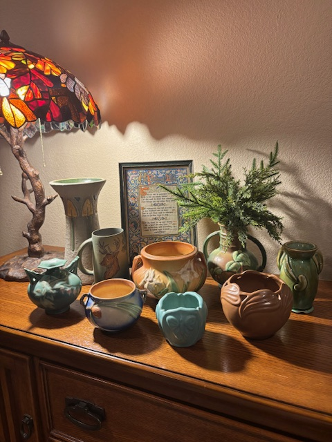 Anne received her first piece of Roseville pottery from her grandmother shortly before her death in 2005, and its story piqued her interest in this lovely household art from a bygone time. Her grandmother won the small, pinecone-pattern jardiniere as a prize at a canasta party in the mid 1930s. And every piece Anne’s encountered since–the tonal colors, the nature themes, the graceful structure that communicates a simpler time–well, she claims they just don’t compare to the pottery produced today.