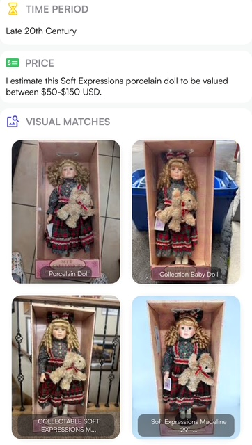 Curio estimates this doll to be worth between $50 and $150. Currently she is for sale at $40, just waiting for the right person to take her home.