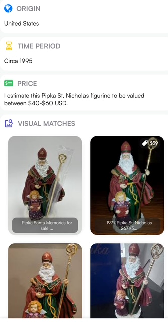 Pipka Ulvildan is an American artist from Sister Bay, Wisconsin, influenced by the folk art she brought with her family when they immigrated to the United States from Czechoslovakia shortly after WW2. Since her work was first introduced to the public in the mid-1990s, she’s gained a reputation for her attention to the history and cultural tradition of the many hand-painted holiday figurines she creates. With Prism Inc. as her manufacturing partner, all of Pipka’s pieces are hand-painted and limited editions. Currently for sale in DiAnnetiques is a Pipka St. Nicholas figurine for $12 although Curio estimates the same piece to be in the $40 to $60 range.