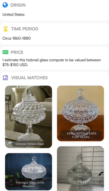 A vintage hobnail candy dish with lid is a charming example of mid‑century glassware, prized for its textured design and timeless appeal. The dish features the signature hobnail pattern—raised, rounded bumps that catch the light beautifully—giving it both tactile interest and sparkling elegance. Its lidded top not only preserves sweets or small treasures but also adds a graceful silhouette, often crowned with a knob or finial for easy handling. Typically crafted in milk glass or colored pressed glass, these pieces embody nostalgic craftsmanship, making them a delightful accent for collectors and a functional yet decorative addition to any table. Although we can’t be sure, we believe the candy dish in our curio actually dates to the late 19th century when our great grandparents were forging their way west to stake a homestead claim on the American prairie. But–because there are no discernible marks to help us make that call, its for sale for a mere $20.